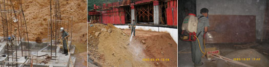 (2)室內(nèi)地坪回填平整后,在澆混凝土地坪或擱置防潮架空板之前,在離內(nèi)墻面四轅50cm墊層噴澆藥液。根據(jù)地坪滲透性,每米均勻連續(xù)噴澆稀釋劑 3000g左右。廚房、衛(wèi)生間等經(jīng)常受潮的房間,用外來雜土回填的地基,地處舊城區(qū)或山邊雜地凡室內(nèi)未經(jīng)開挖的部分地基,都可能有白蟻隱患,應(yīng)全面施藥。根據(jù)地坪滲透性,每平方米均勻噴澆稀釋劑 3000g左右。